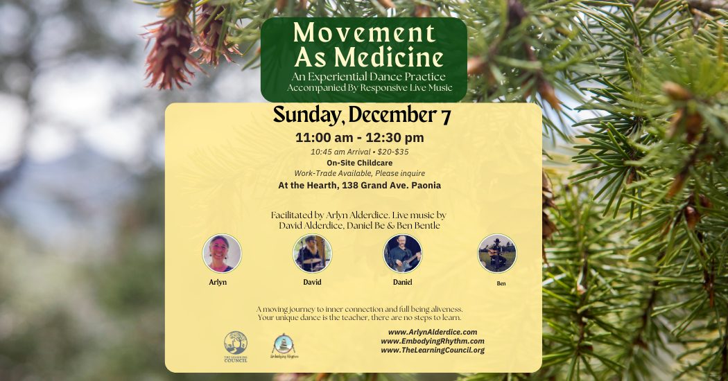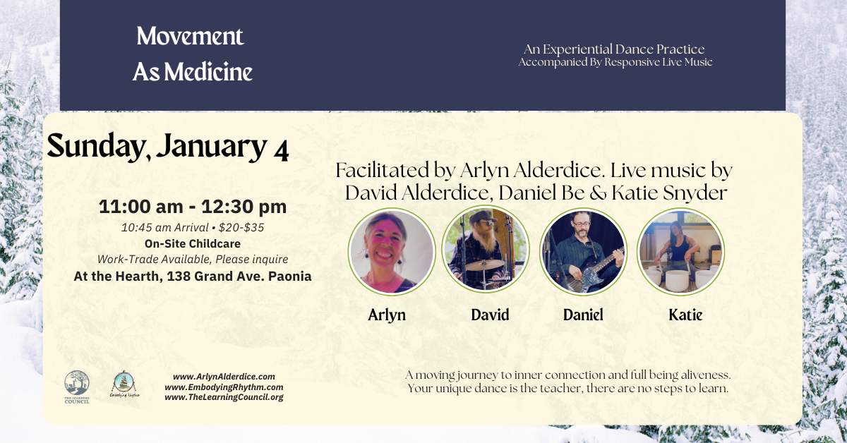 facilitated by Arlyn Alderdice with responsive live music from David Alderdice, Daniel Be, and Katie Snyder ending the dance with a sound healing |
